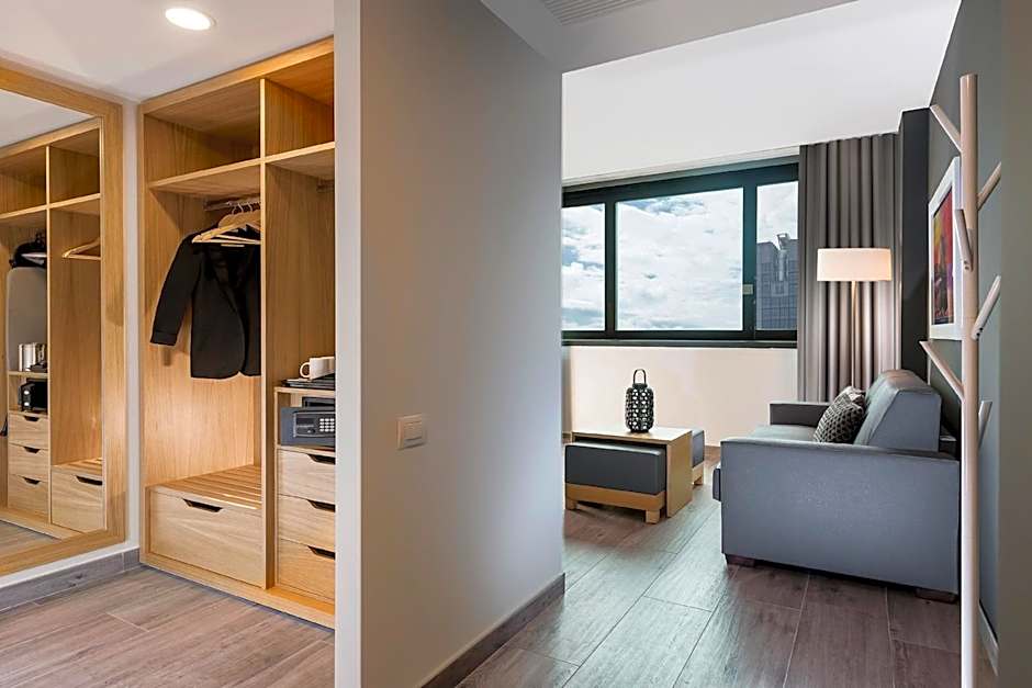 This suite features a tea/coffee maker, electric kettle and bathrobe. Wood effect porcelain stoneware floor.